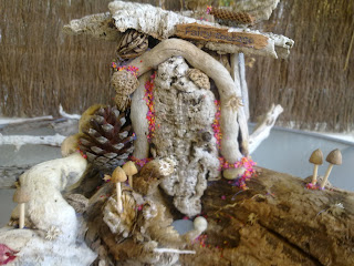 have been really busy this week making new dolls and had a great idea for a huge log my other half found on beach whilst fishing, i looked at it for a long while then decided it would look great with a fairy door on it, i started then got carried away and turned it into a house.